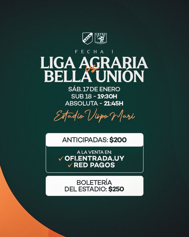 La Confederación Litoral se pondrá en marcha el próximo sábado con sus dos Series, donde Liga Agraria estará recibiendo a Bella Unión en el Estadio Juan José Vispo Mari y ya están a la venta las entradas en OFI ENTRADA.UY o RED PAGOS a $ 200 en forma anticipadas. Por su parte en las boleterías del estadio, el valor será de $ 250.