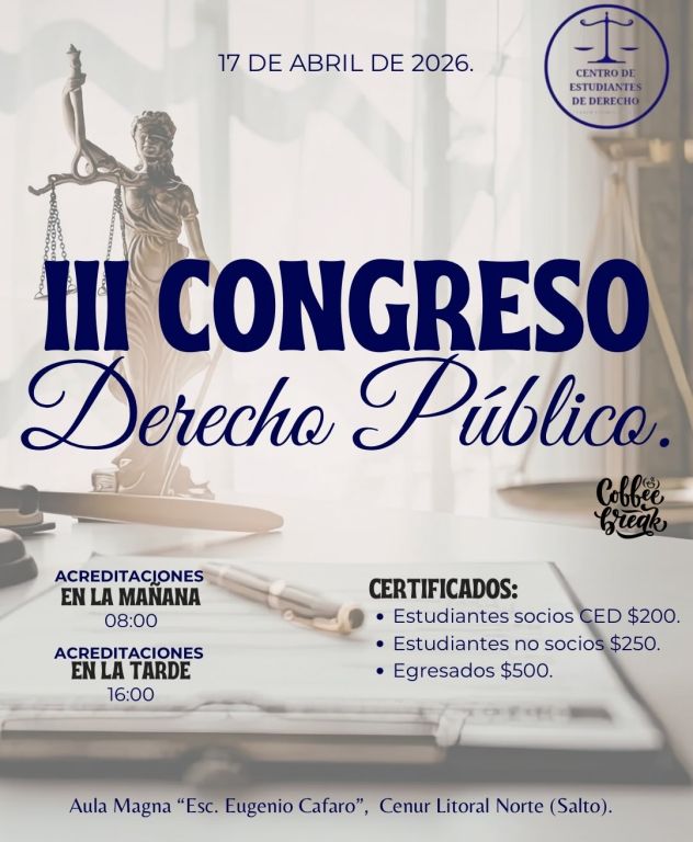 El Centro de Estudiantes de Derecho del Cenur Litoral Norte anunció la realización del III Congreso de Derecho Público, una propuesta académica que convocará a estudiantes, docentes y profesionales del área jurídica el próximo viernes 17 de abril, en el Aula Magna “Esc. Eugenio Cafaro” de la sede Salto.