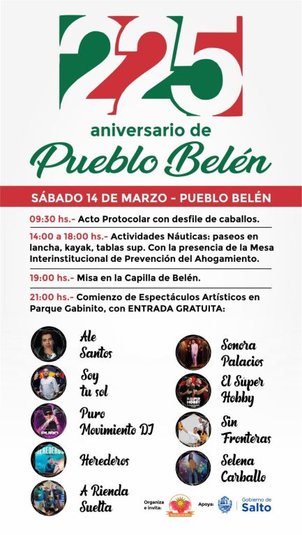 El próximo sábado 14 de marzo, la localidad Belén conmemora 225 años de su fundación, una fecha de profunda relevancia histórica y social para el departamento de Salto. En este marco, el Municipio de Belén, con el apoyo del Gobierno de Salto, tiene preparada una extensa programación que se desarrollará durante toda la jornada, combinando actos protocolares, recreación náutica y un cierre artístico de primer nivel.