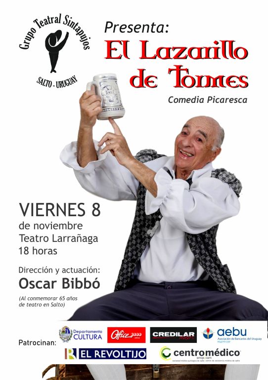 El Grupo Teatral “Sintapujos” vuelve a reponer “El Lazarillo” después de su estreno en el 2019 con gran éxito de público.  Ésta vez también volverá a nuestro máximo escenario: el Teatro Larrañaga, para llevarla a escena. Pero además la función de este viernes que viene, adquiere mayor trascendencia por conmemorarse ese día 8 de noviembre la fecha fundacional de nuestra ciudad de Salto, fundada en 1756 por Joaquín de Viana.