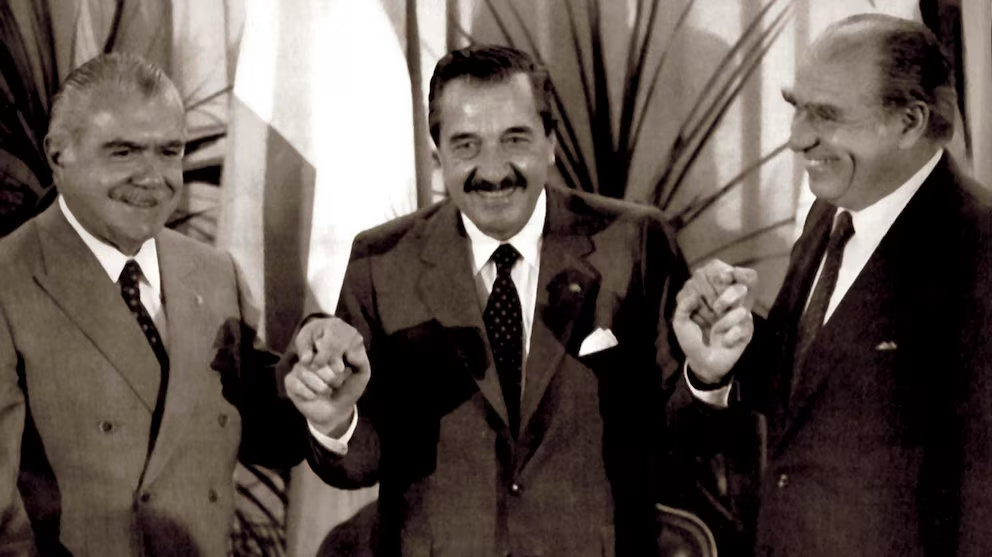 Los presidentes Raúl Alfonsín, José Sarney y Julio María Sanguinetti durante la cumbre de Colonia de Sacramento el 6 de Febrero de 1988.