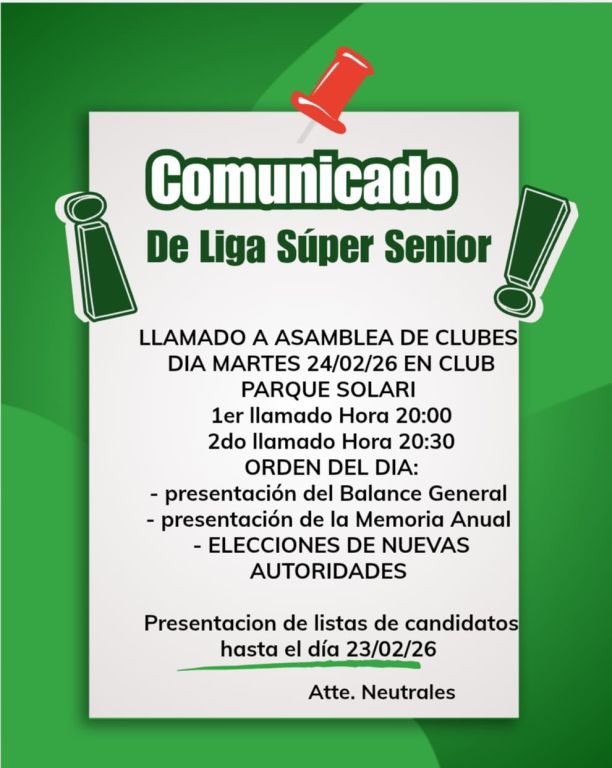 Desde la Liga Super Senior el llamado a Asamblea de Clubes, que se estará realizando el martes 24 de febrero en la Sede del Club de Parque Solari.