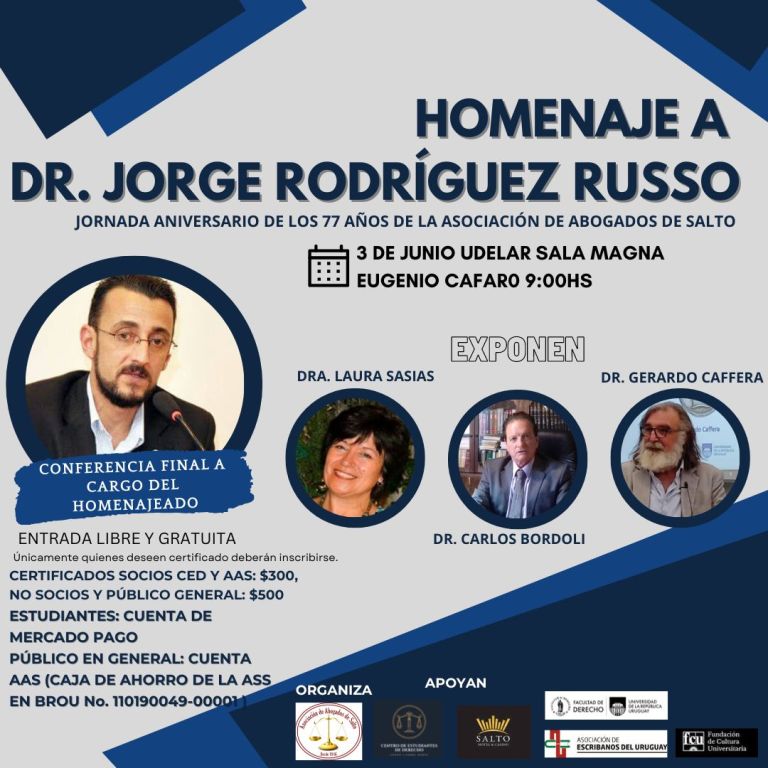 El Dr. Jorge Rodríguez Russo nació en Artigas, habiéndose trasladado a Salto para realizar sus estudios. Se recibió de Abogado y desde siempre ha estado vinculado a la Regional Norte de la Universidad de la República. El pasado año alcanzó el máximo grado académico como docente, siendo el primero que logra este hito de forma íntegra en la casa de estudios en Salto. Esto llevó a la determinación de que este año, la Asociación de Abogados de Salto resolviera homenajearlo a través de una jornada sobre derecho civil, su especialidad.