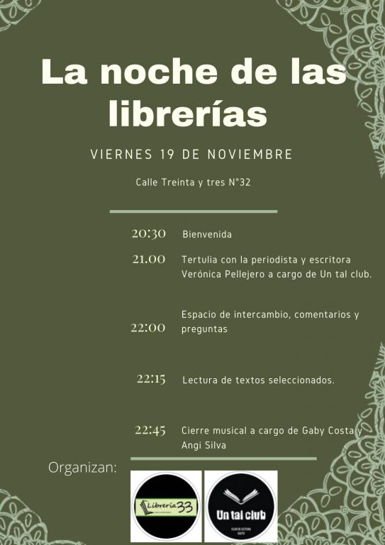 Tendrá lugar en calle Treinta y Tres Nº32, comenzará a las 20:30 hs dando la bienvenida a los presentes. A las 21:00 Tertulia con la periodista y escritora Verónica Pellejero a cargo de Un tal Club. A las 22:00 habrá un espacio de intercambio, comentarios y preguntas. 22:15 Lectura de textos seleccionados. 22:45 Cierre musical a cargo de Gaby Costa y Angi Silva. Dicha actividad es organizada por Librería 33 y Un tal Club.