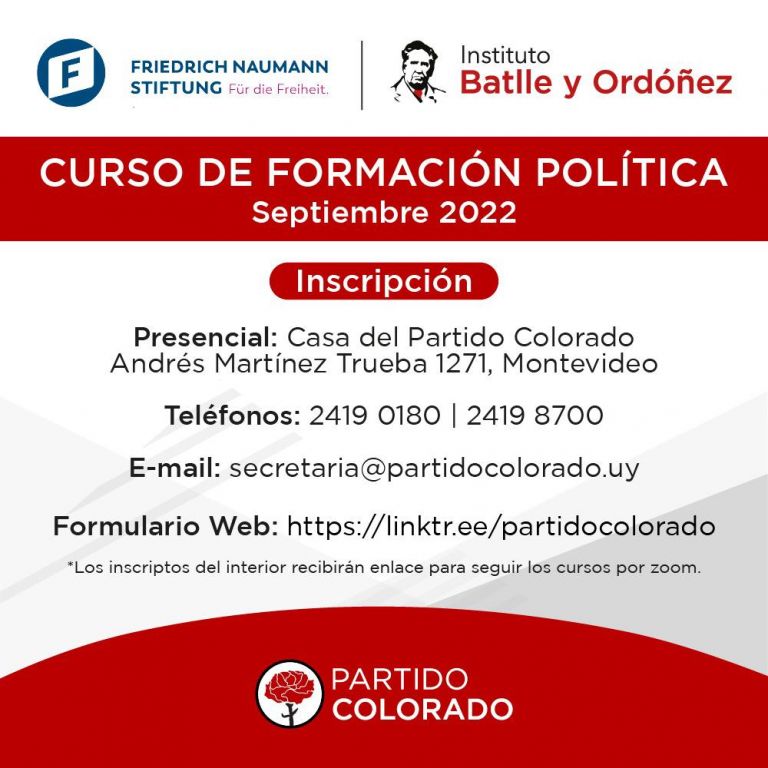 Un destacado panel de docentes del Partido Colorado dictará un Curso de Formación Política a partir del mes de setiembre en su sede partidaria montevideana, el que también podrá seguirse vía zoom desde cualquier parte del país. Las charlas estarán a cargo del Dr. Julio María Sanguinetti, y- entre otros- de los conferencistas Prof. Manuel Flores Silva, Dr. Nicolás Albertoni, Ec. Ignacio Munyo, Ec. Isaac Alfie, Dr. Ope Pasquet, Lic. Oscar Padrón Favre, Dr. José Garchitorena, y el Dr. Didier Opertti.
